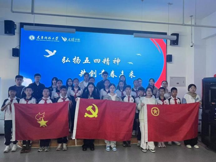 生工第一学生社区生物工程本科生第一党支部党员、2022级生物工程卓越人才实验班团支部团员蒋雯杰、甘延林面向塘沽湾学校少先队员开展“弘扬五四精神,共创青春未来”主题宣讲,详细讲述了中国共产主义青年团自成立以来,一直是中国青年运动的核心力量,在推动中国社会进步和青年成长方面发挥了不可替代的作用。随后通过精选的视频资料,向少先队员们展示了在巴黎和会上中国外交失败后,1919年5月4日发生在北京的一场以青年学生为主,广大群众、市民、工商人士等阶层共同参与的爱国运动,这是中国人民彻底的反对帝国主义、封建主义的爱国运动。通过主题宣讲和观看视频,教育引领广大青少年不负青春,不负韶华,承担起历史赋予的责任,为中华民族伟大复兴作出贡献。