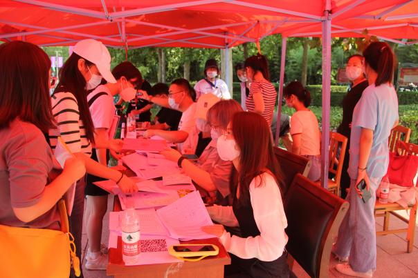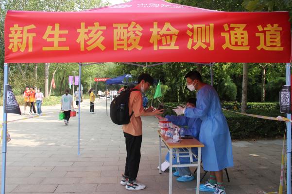 为保学生防疫安全,学院安排志愿者们在新生核酸检测点位进行轮班值守,指导下载软件、录入信息、分发试管,重复成百上千次的动作,为新生们入校第一检提供便利。