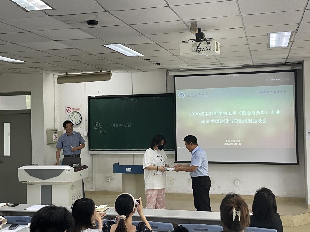 为加强生物工程学院2020级生物工程(酿造与蒸馏)(中外合作办学)专业学风建设,进一步引导学生明晰个人职业规划与发展方向,鼓励学生培养好的学习方法、好的心态和坚定的信念,6月1日上午,生物工程学院于滨海中校区3号楼109召开专业学业学风建设与职业规划座谈会,生物工程学院党委书记杜岩刚,党委副书记、纪委书记曾昭晔,副院长滕玉鸥,本科教务科、国际化教研室负责人和2020级辅导员参加会议。座谈会由生物工程学院党委副书记、院长罗学刚主持。