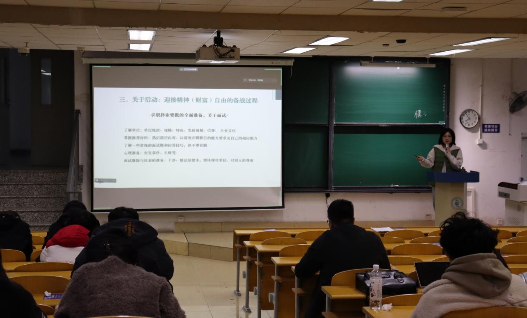 会上,周老师围绕当前就业形势、如何谋定而后动、保持可持续三个方面进行讲解。一是当前就业形势,2024届高校毕业生规模预计1179万人,同比增加21万人,在就业形势依然严峻的当下,同学们不仅要抓紧明晰就业方向求职面试,也可以关注三支一扶、志愿服务西部、应征入伍等基层就业空间,周老师鼓励学生把辛勤劳动与成就价值结合、把职业选择与社会需求结合、把人生出彩与国家富强结合。