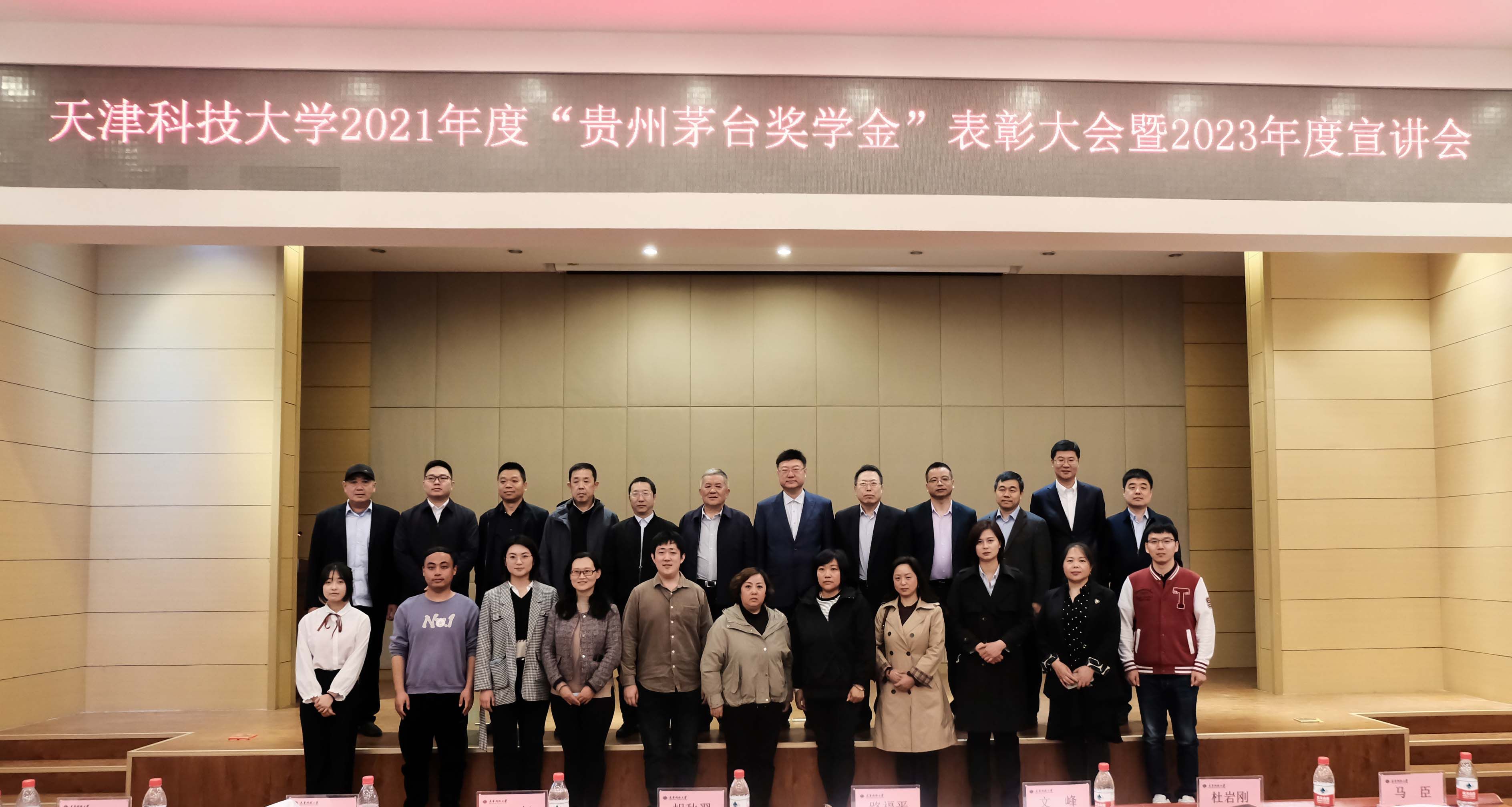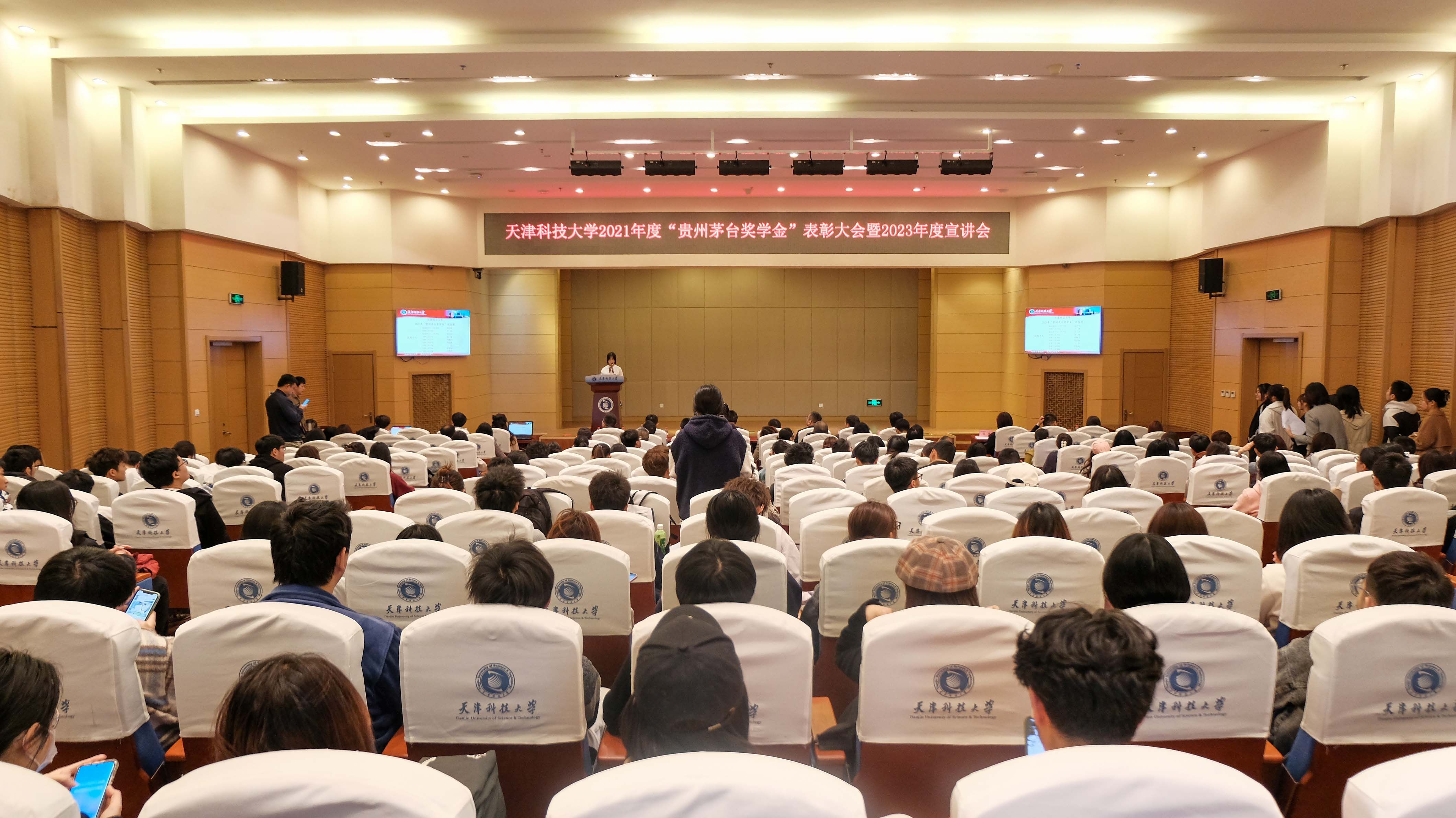 4月3日,天津欧美性爱免费2021年度“贵州茅台奖学金”颁奖典礼暨2023年度宣讲会在滨海中校区逸夫楼报告厅举行。贵州茅台天津分公司经理胡秋翌,我校党委副书记、校长路福平,贵州茅台天津经销商联谊会会长宋彪出席典礼并讲话。贵州茅台天津分公司、贵州茅台天津经销商联谊会、我校教育发展基金会、校友办、校团委、学生处等部门负责同志、生物工程学院党政领导班子、教师代表、获奖学生和各学院学生代表一同参加会议。