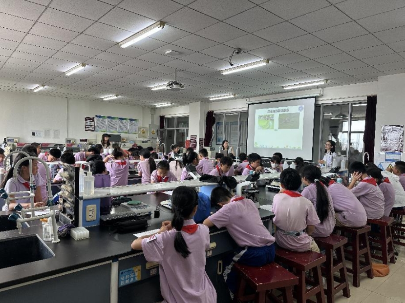 活动中,学院分析测试中心主任黄琳老师,崔琬晶老师分别为小学五年级同学讲授了《奇妙的微生物》和《美丽的海底珊瑚世界》。黄琳老师从微生物的定义、分布、特性及其在食品、医疗、环境、农业领域的科学应用等方面进行了讲解,让学生们对微生物有了更加深入地了解。崔琬晶老师的课程从理论讲解、化学珊瑚花园小实验和课外互动三个环节,带领学生们深入了解了珊瑚的生物学、生态学以及保护意义,通过小实验,让同学们亲手模拟了珊瑚的生长过程,感受到了科学的魅力。“希望通过一些小小的实验,包括这个海底化学的珊瑚形成,能够在孩子们身心里种下一颗科学的种子,让孩子们能更有科研科学创新的意识。”崔琬晶老师说。