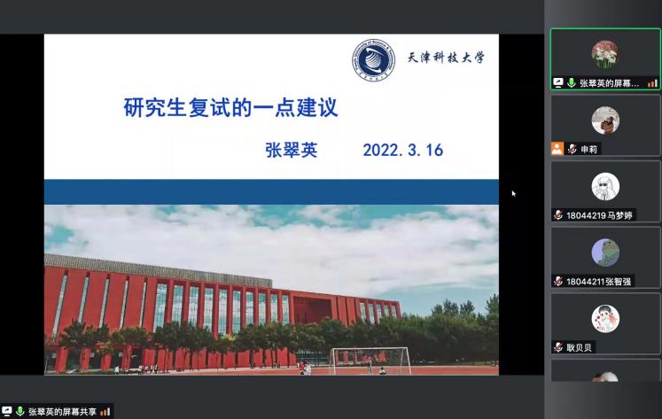 为落实立德树人根本任务,全方位全过程做好毕业生服务保障工作,值此研究生复试、调剂关键阶段,生物工程学院于3月16日、3月17日晚上召开2022届考研线上复试、调剂指导说明会、复试相关问题讲解与咨询会,旨在更好地为考研学子提供信息资源和帮助指导。会议由生物工程学院副院长张翠英,学院博士生导师张成林教授、研究生教务科科长王巨克主讲,2018级辅导员申莉主持。