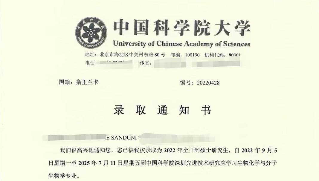 近日获悉,生物工程学院2018级本科留学生SANDUNI被中国科学院大学 深圳先进技术研究院 录取攻读生物化学与分子生物学硕士学位。这是继我校生物工程学院2017级留学生Shashika Janith Liyanage被全球排名的251的德国耶拿大学录取继续攻读医学光子学专业硕士学位,又一位由我校国际化教学团队培养并输送的高质量工科人才。