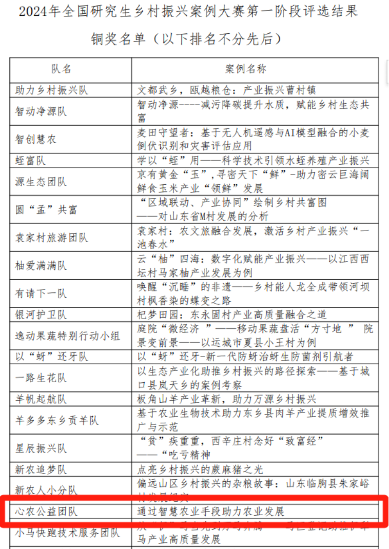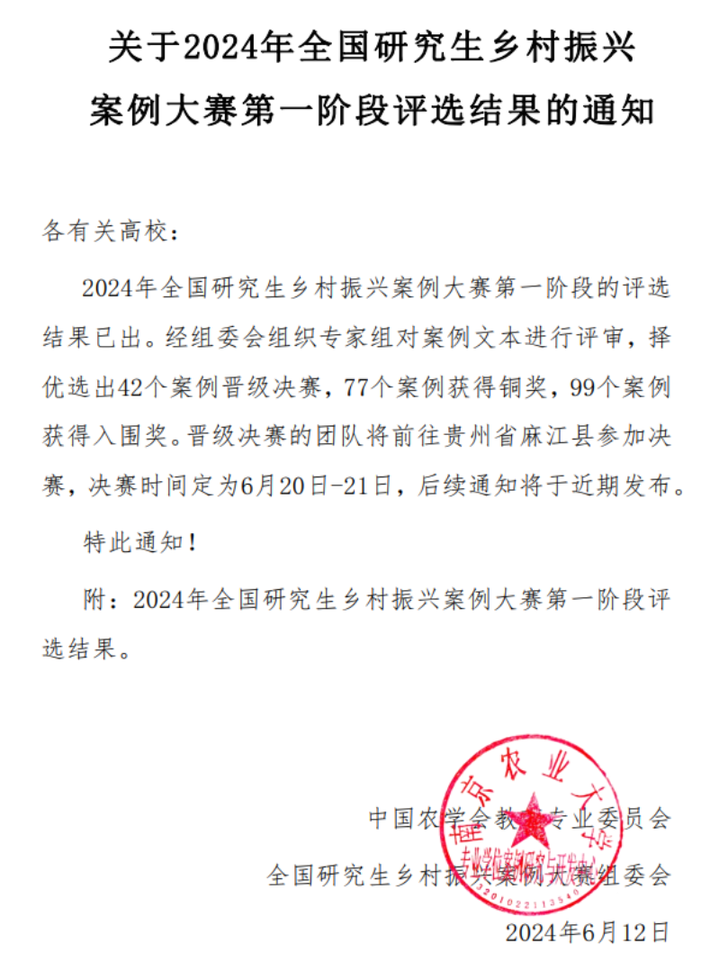 近日,由中国农学会教育专业委员会、全国研究生乡村振兴案例大赛组委会主办的2024年全国研究生乡村振兴大赛评选结果已出。经组委会组织专家组对所有参赛高校的案例文本进行评审,择优选出42个案例晋级决赛,77个案例获得铜奖,99个案例获得入围奖。生物工程学院2023级研究生沈秋岑获得铜奖、2023级研究生杨逸涵和刘眉伶获得入围奖。