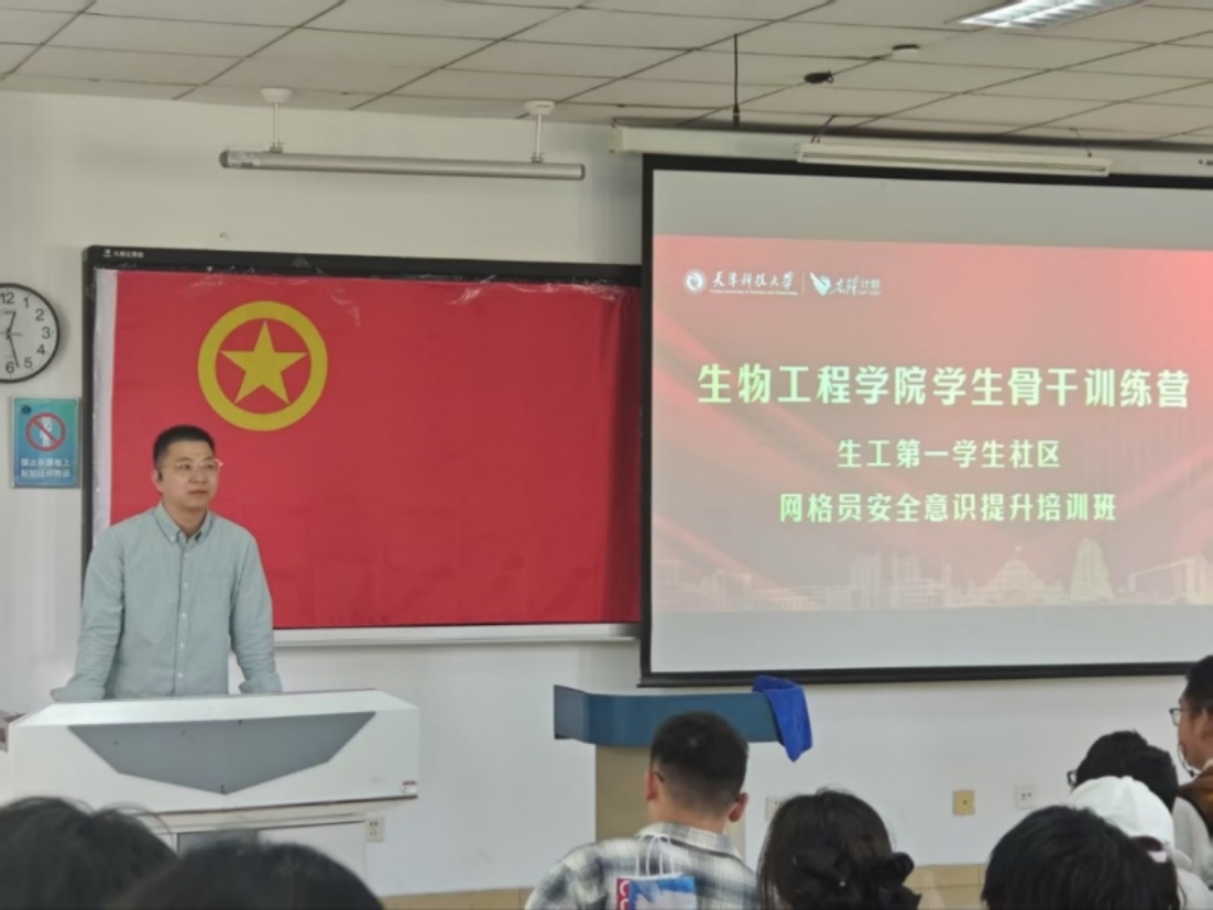 为深入学习宣传贯彻党的二十大精神和习近平总书记关于青年工作的重要思想,全面贯彻落实学校第四次党代会精神,2025年4月10日,生物工程学院举行2025年学生骨干训练营第二讲网格员安全意识能力提升专项培训班。学院特邀黄海路派出所反诈民警刘警官、王警官做专项培训,学院正科级辅导员赵华民主持,学院160名学生社区网格员(宿舍长)参训。