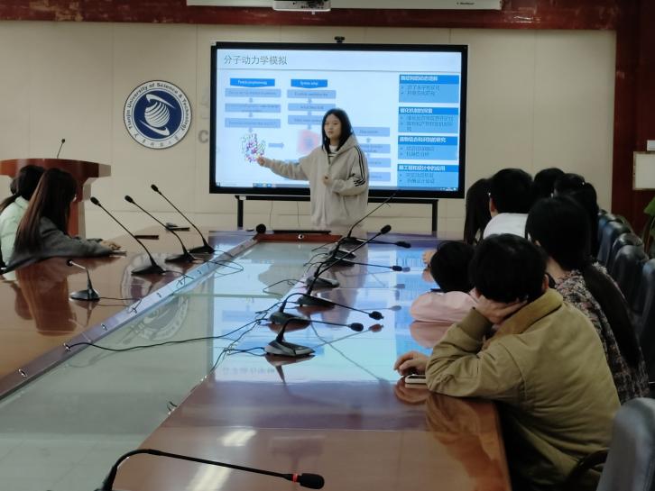国家奖学金获得者吴新明结合分子模拟辅助酶的理性设计的科研经历与同学们进行了分享。吴新明通过强调分子模拟技术在现代生物化学研究中的重要地位对本次宣讲进行展开,她通过多个层次将计算机技术和生物技术融合的发展前景和未来的科研安排与参会的师生做了详细的沟通交流,与参会的同学展开良好的互动,促进了多学科、多内容的交流。同时,她还鼓励同学们保持好奇心,勇于尝试新技术,同时也要注重理论知识的学习,打下坚实的学术基础。