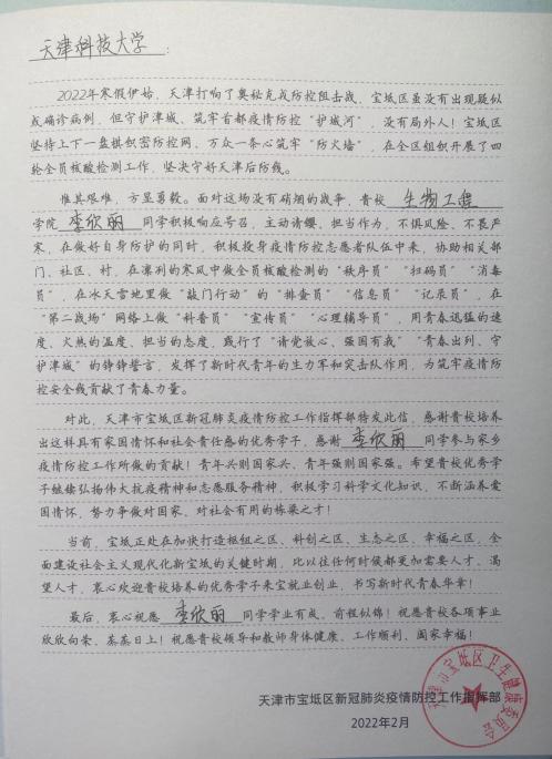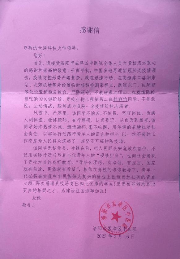 近日,宝坻区疫情防控指挥部、洛阳市孟津区中医院向我校发来感谢信,信中对生物工程学院2021级制药工程专业牛晨曦同学、2020级生物工程专业李欣丽同学、2018级制药工程专业杜容竹同学在这场没有硝烟的战争中的突出表现表示衷心的感谢和崇高的敬意!