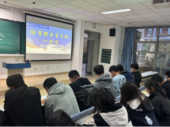 在班委的带领下,各班级同学在教室里以笔为媒介,与期末的自己展开一场跨越时空的对话。信中同学们对自己的课程学习以及学习方法进行了详细的计划,更值得一提的是,同学们还将目光投向了个人未来的发展,将此次写信活动与生涯规划紧密相连。